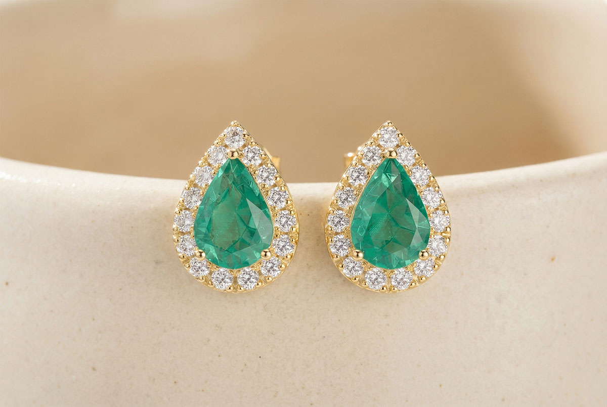« L'ATELIER » NR. 201414Oorbellen Geelgoud 9 karaat - Smaragd Peer 0.3 Karaat (2 X) - Halo Diamant