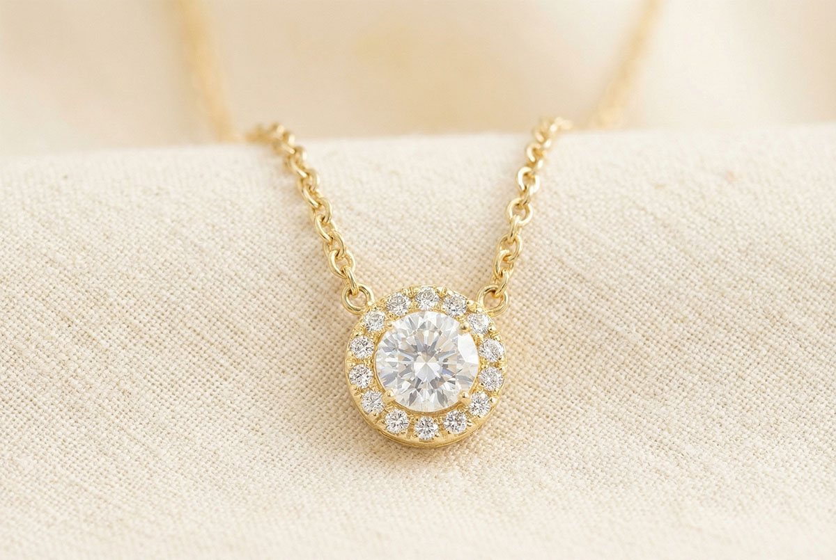 « L'ATELIER » NR. 201642Halsketting Geelgoud 9 karaat - Laboratorium diamant rond 0.3 Karaat - Halo Laboratorium diamant - Ketting Gourmet
