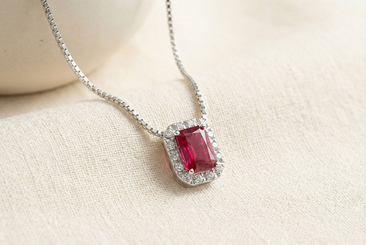 « L'ATELIER » NR. 201903Halsketting Witgoud 18 karaat - Robijn Rechthoekig 0.3 Karaat - Halo Diamant - Ketting Venetiaans