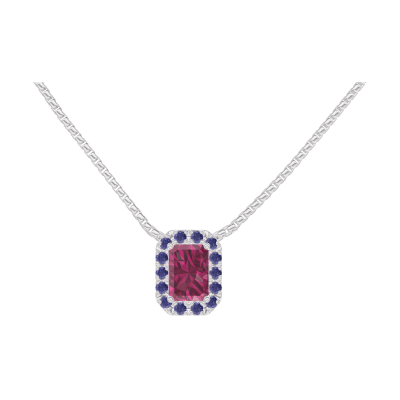 « L'ATELIER » Nº201919Halsketting Witgoud 18 karaat - Robijn Rechthoekig 0.3 Karaat - Halo Blauwe saffier - Ketting Venetiaans