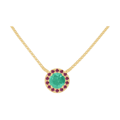 « L'ATELIER » Nº202230Halsketting Geelgoud 9 karaat - Smaragd rond 0.3 Karaat - Halo Robijn - Ketting Venetiaans