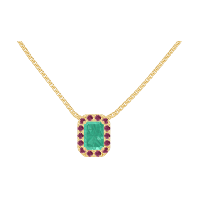 « L'ATELIER » Nº202293Halsketting Geelgoud 18 karaat - Smaragd Rechthoekig 0.3 Karaat - Halo Robijn - Ketting Venetiaans