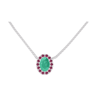 « L'ATELIER » NR. 202328Halsketting Witgoud 9 karaat - Smaragd Ovaal 0.3 Karaat - Halo Robijn - Ketting Venetiaans