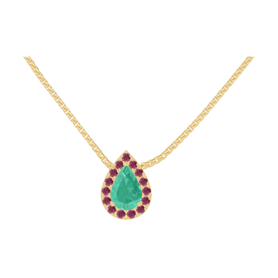 « L'ATELIER » Nº202358Halsketting Geelgoud 9 karaat - Smaragd Peer 0.3 Karaat - Halo Robijn - Ketting Venetiaans