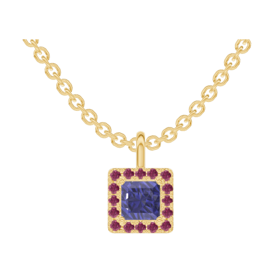 « L'ATELIER » Nº206161Hanger Geelgoud 18 karaat - Blauwe saffier Prinses 0.3 Karaat - Halo Robijn - Ketting Gourmet