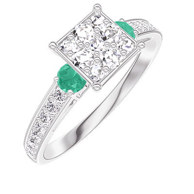 « L'ATELIER » Nº210988Ring Witgoud 9 karaat - Cluster van natuurlijke diamantent Prinses gelijkwaardig 1 - Aanleunende edelstenen Smaragd - Setting Diamant
