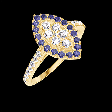 « L'ATELIER » Nº211677Ring Geelgoud 18 karaat - Cluster van natuurlijke diamantent Markies gelijkwaardig 0.5 - Halo Blauwe saffier - Setting Diamant