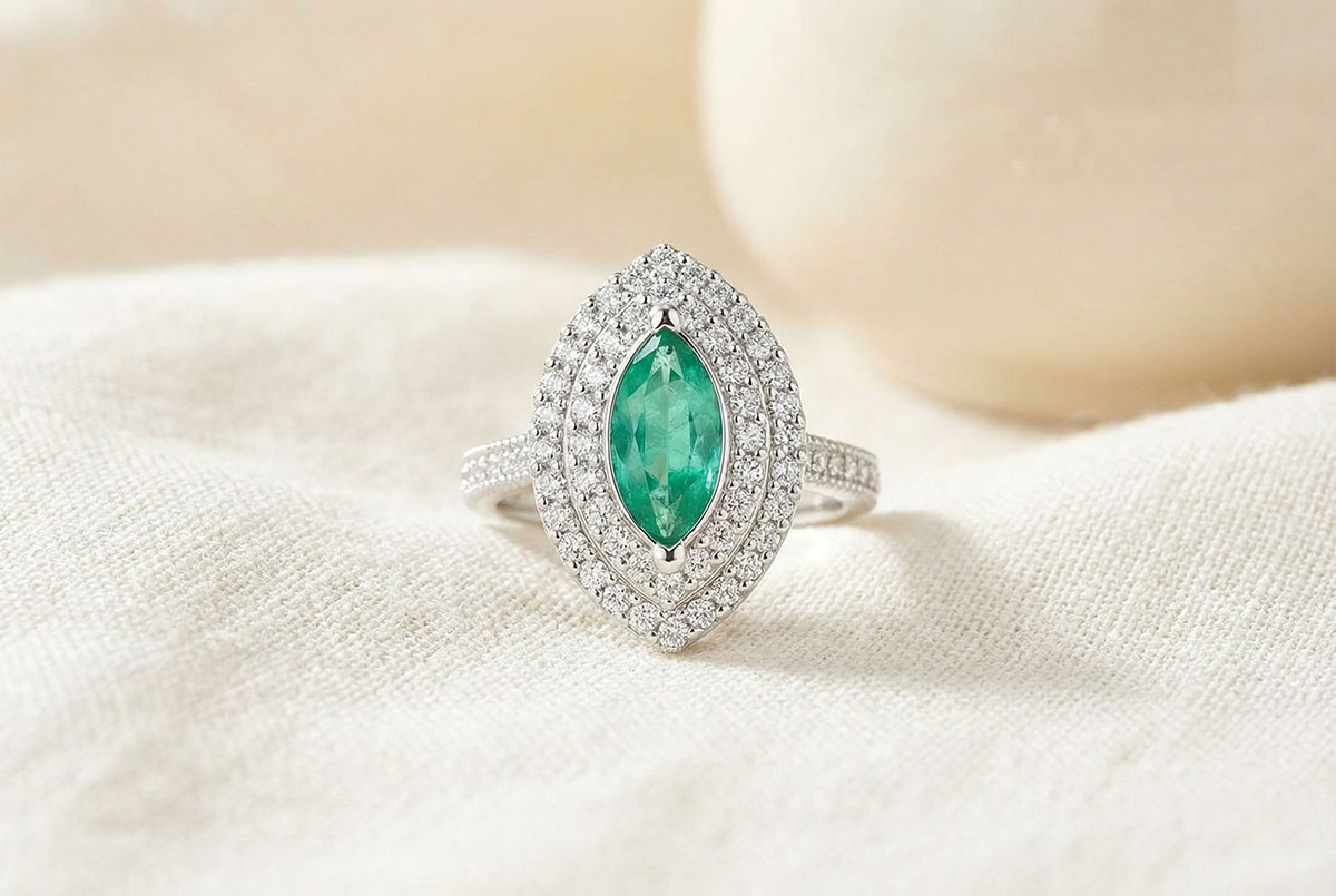 « L'ATELIER » NR. 406511Ring Witgoud 18 karaat - Smaragd Markies 0.5 Karaat - Halo Diamant - Setting Diamant