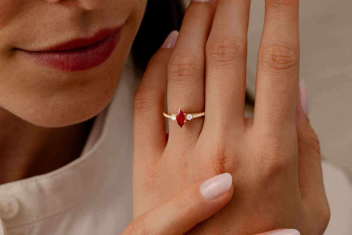 « L'ATELIER » Nº419658Ring Geelgoud 18 karaat - Robijn Markies 0.5 Karaat - Aanleunende edelstenen Diamant - Setting Diamant
