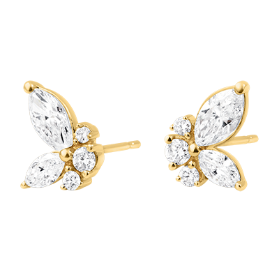 De "Middernacht Vlinder" geelgouden oorbellen zijn prachtig versierd met synthetische diamanten in marquise en ronde vormen, gerangschikt als een vlinder.