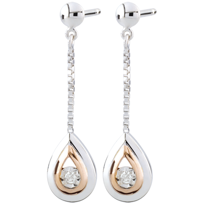 Twee delicate tranen in witgoud en roségoud, met een glinsterende diamant in het midden.