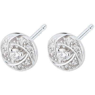Een solitairee diamant gekruld in witgouden studs ingelegd met briljanten.
