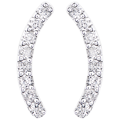 Een paar fijne, lichte met diamanten bezette oorbellen die als een aanhalingsteken tegen de oorlel of als knopje gedragen kunnen worden.