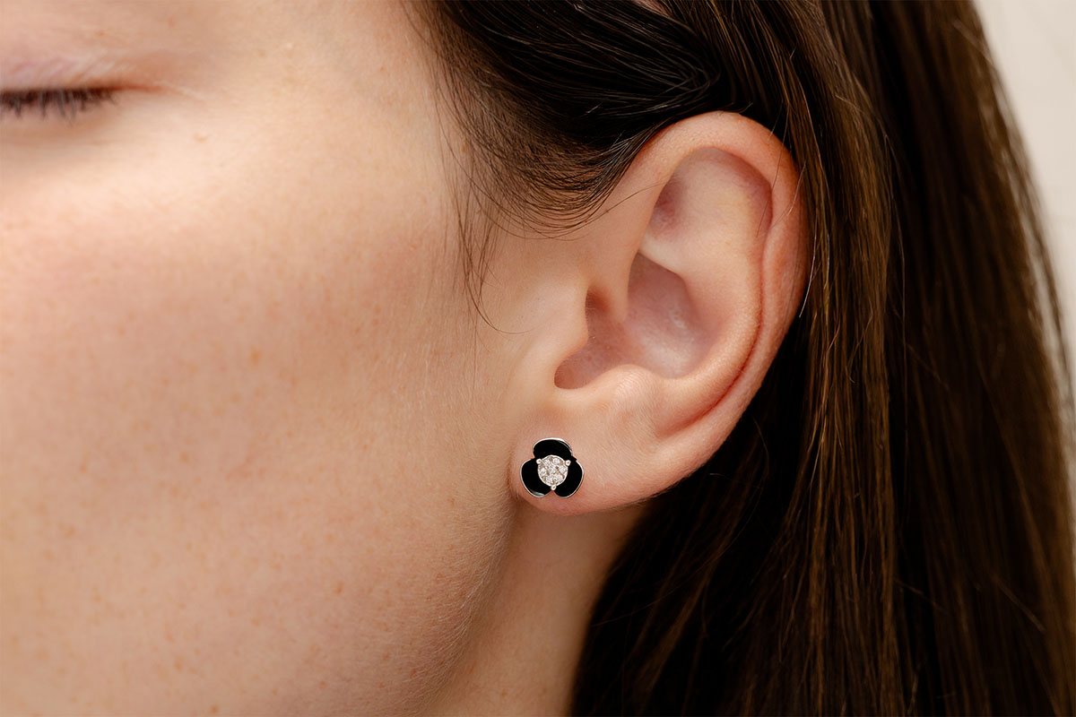 Een paar zwarte bloemen met 3 bloemblaadjes met in hun hart een groot aantal diamanten.