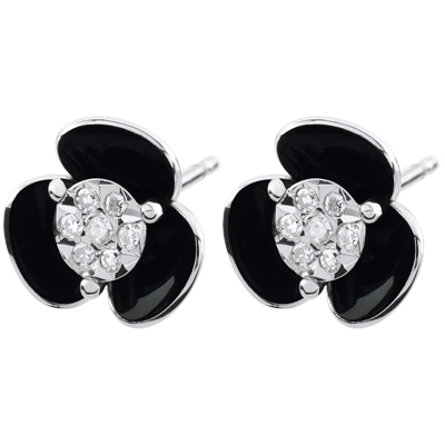 Een paar zwarte bloemen met 3 bloemblaadjes met in hun hart een groot aantal diamanten.