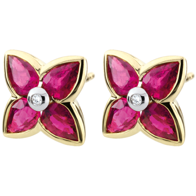 Een vierpuntige ster van robijnen met in het midden een diamant.