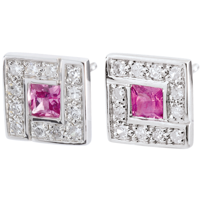 Twee roze geslepen Saffieren worden elk omringd door een vierkant met ingelegde diamanten.