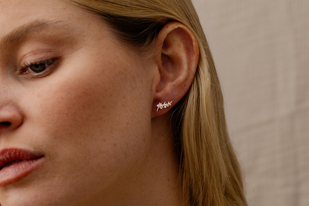 Afwisselend blad roségoud en schitterende met de hand geborstelde bladeren, voor romantische oorbellen met 12 diamanten.