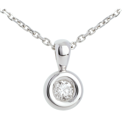 Een diamant genesteld in het hart van een witgouden kelk, voor een afgeronde hanger.