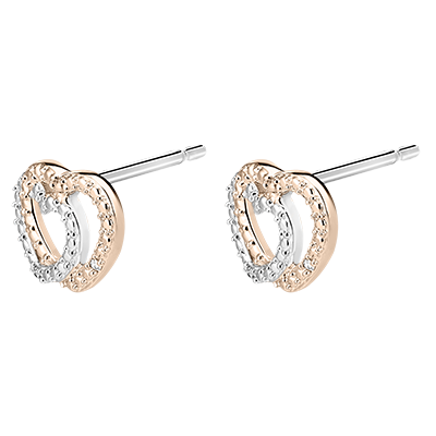 Dit paar oorbellen, duo van harten in wit of roségoud bewerkt als diamanten en ingelegd met diamanten, inspireert tot tederheid en medeplichtigheid.