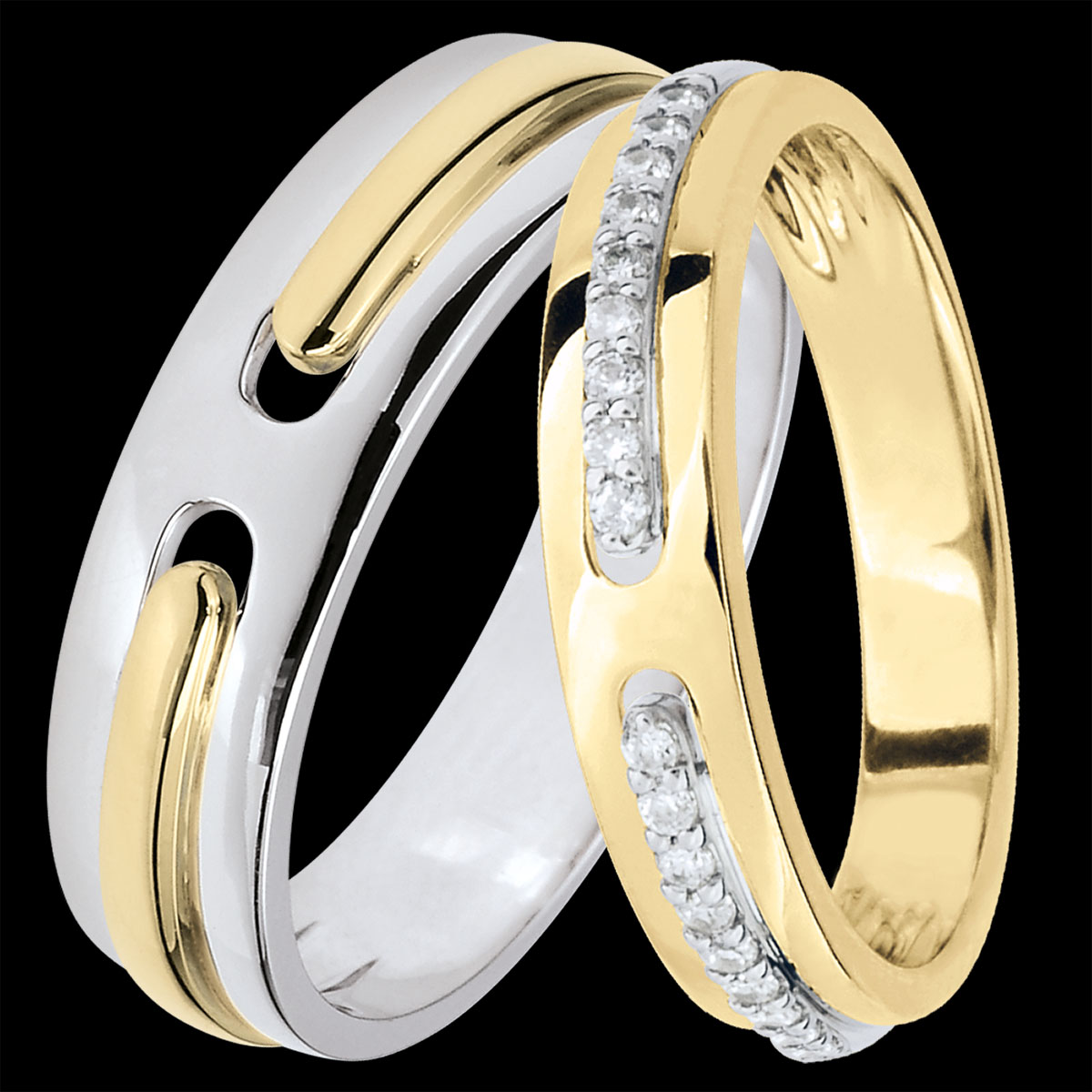 Een elegant paar trouwringen voor haar & hem. Twee diamanten lijnen verbonden als een eeuwige belofte in een geelgouden ring voor haar; twee geelgouden lijnen verenigd als symbool van eeuwigheid in een witgouden ring voor hem.