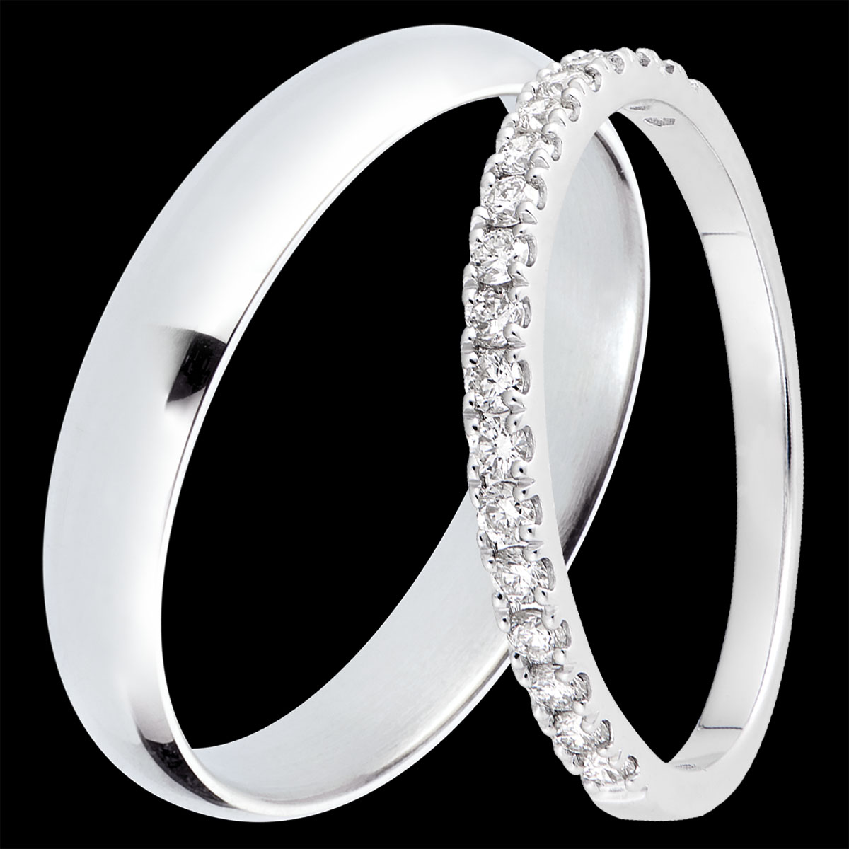 Een elegant paar trouwringen voor haar & hem. Voor haar een half pavé ring met 18 diamanten van in totaal 0,26 karaat. Voor hem een gepolijste witgouden band van 4 mm breed.