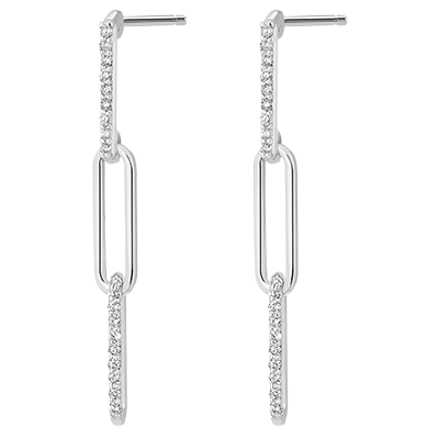 Een trio delicaat met diamanten bezette witgouden schakels slingert elegant. Een paar moderne en vrouwelijke bungelende oorbellen.