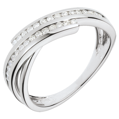 Twee rijen van diamanten komen samen in een beweging op witgoud.