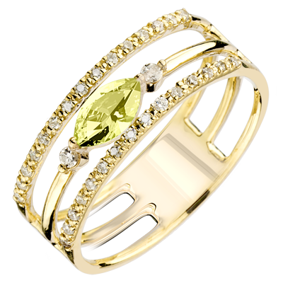 Als twee waardevolle oogleden beschermen de gouden en diamanten lijnen de kostbare pupil, gesymboliseerd door een spoel van peridot. Een gesofisticeerde ring om alle dagen te dragen of bij grote gelegenheden.