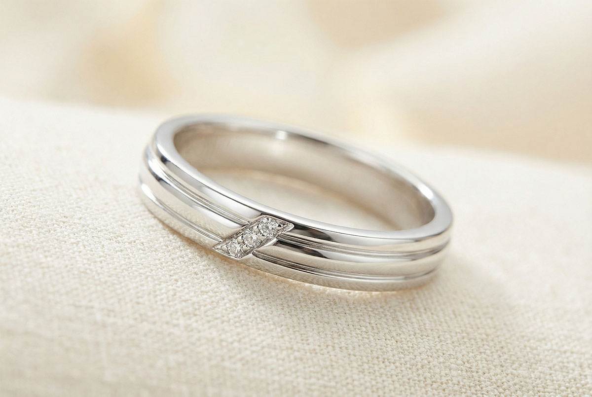 Deze ring heeft een resoluut modern design: twee rechte horizontale lijnen met daarboven een ringklauw bezet met 3 diamanten.