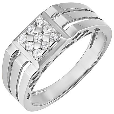 Een zegelring waarvan de witgouden basis subtiel is uitgesneden en waarvan het midden royaal is bezet met 9 diamanten.