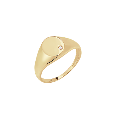 Een geelgouden zegelring waarvan de ovale plaat is bezet met een schitterende diamant. Een resoluut modern juweel.
