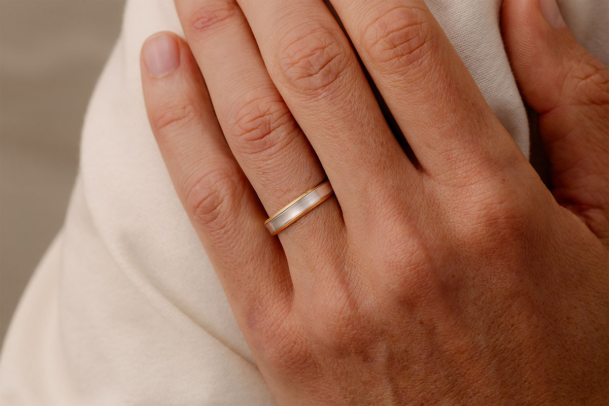 Minimalistische ring die zich onderscheidt door zijn subtiele geborstelde witgoud en geelgoud.