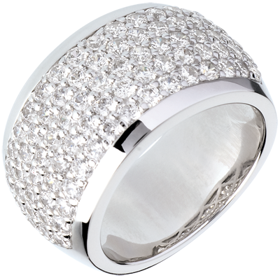 De iriserende schittering van een diamanten pavézetting geraffineerd en verzorgd, voor een uitzonderlijke ring.