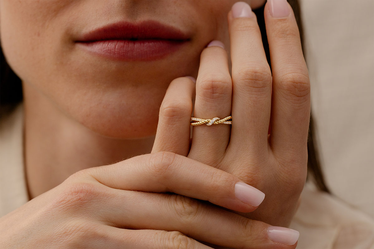 Een ring waarin een gouden koord zich verstrengelt met een diamanten ring, als een eeuwige omhelzing.