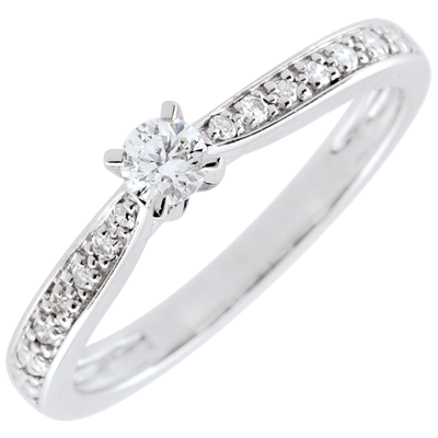 Een diamanten solitaire wordt door 4 pootjes gedragen op een verfijnd frame bezet met diamanten.