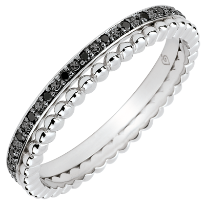 Een cirkel van witgoud bezet met zwarte diamanten vormt een delicaat duo met een cirkel van witgouden pareltjes. Een vrouwelijke trouwring, klassiek en origineel tegelijk.