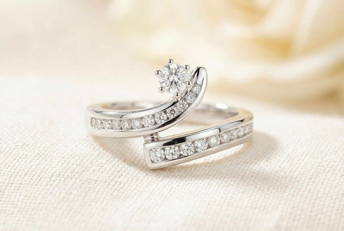 Een diamant, zoals een ster en haar train in witgoude pavézetting schitteren zoals duizenden lichtpunten.