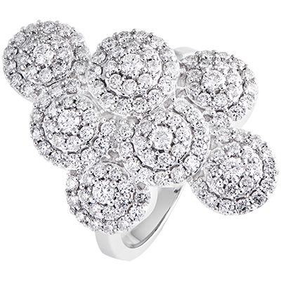 Een uitzonderlijke ring met pompons van halo’s diamanten. Een karaktervolle creatie in de codes van de hoge juwelierskunst.