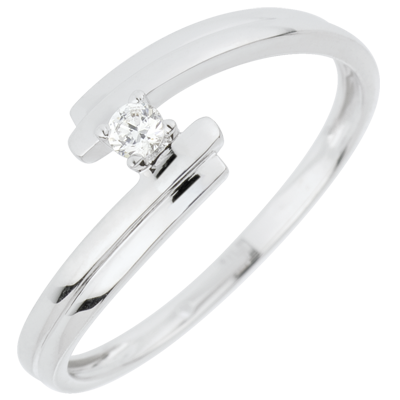 Een solitairee diamant schittert in witgouden armen.
