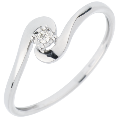 Diamant ondersteund door witgoud glanst in het hart van een gebogen witgouden frame.
