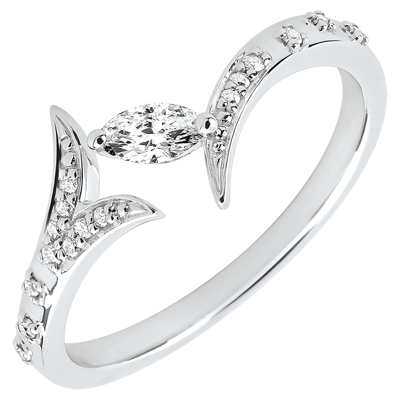 Een schitterende tak, tijdloos bevroren, is deze eeuwenoud of nieuw geboren? Zijn kostbare blad, zijn zaadje in diamant, worden versterkt door het witgoud, bezet met de diamanten die hen omkaderen.