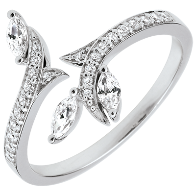 Een schitterende tak, tijdloos bevroren, is deze eeuwenoud of nieuw geboren? Zijn kostbare bladeren, zijn zaadjes in diamant, worden versterkt door het witgoud, bezet met de diamanten die hen omkaderen.