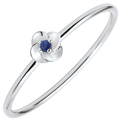 De bloemblaadjes van deze kleine roos in witgoud zijn geopend op een Saffier hart voor de eeuwigheid.