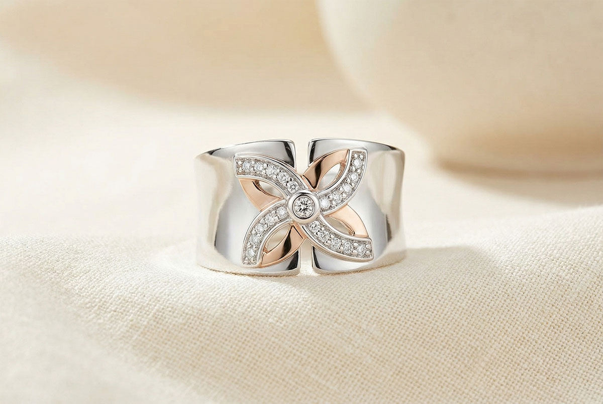 Een lelie gestileerd in witgoud en roségoud ligt op een groot en waardevol frame.