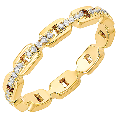 Royale Cubaanse schakels waarvan de staaf met diamanten is bezet, laten deze geelgouden ring schitteren. Een klassieker die opnieuw bezocht is.