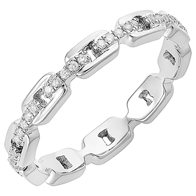 Royale Cubaanse schakels waarvan de staaf met diamanten is bezet, laten deze witgouden ring schitteren. Een klassieker die opnieuw bezocht is.