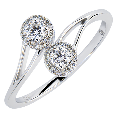 De symmetrische weerkaatsing van twee ronde diamanten, omgeven door een ring van diamanten, voor een symbolische, vrouwelijke ring.