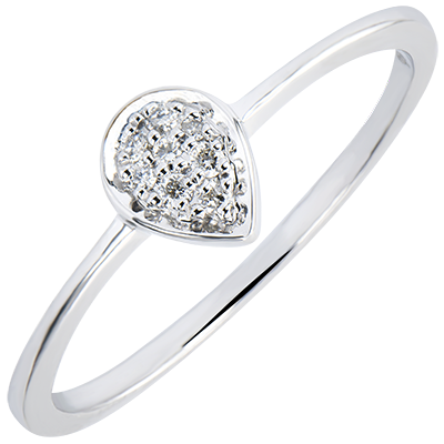 Een bezette druppel gezet op een witgouden ring, voor een zuiver model, verwant met de elementen en de emoties.