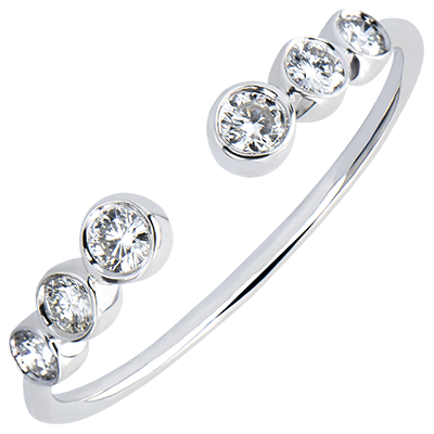 Een jong en creatief model samengesteld uit 6 ingesloten diamanten, die elkaar in echo antwoorden. Een verfijnde, bijzonder vrouwelijke ring.